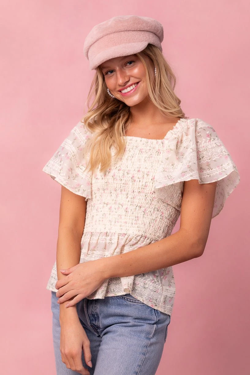 cream floral eyelet smocked blouse