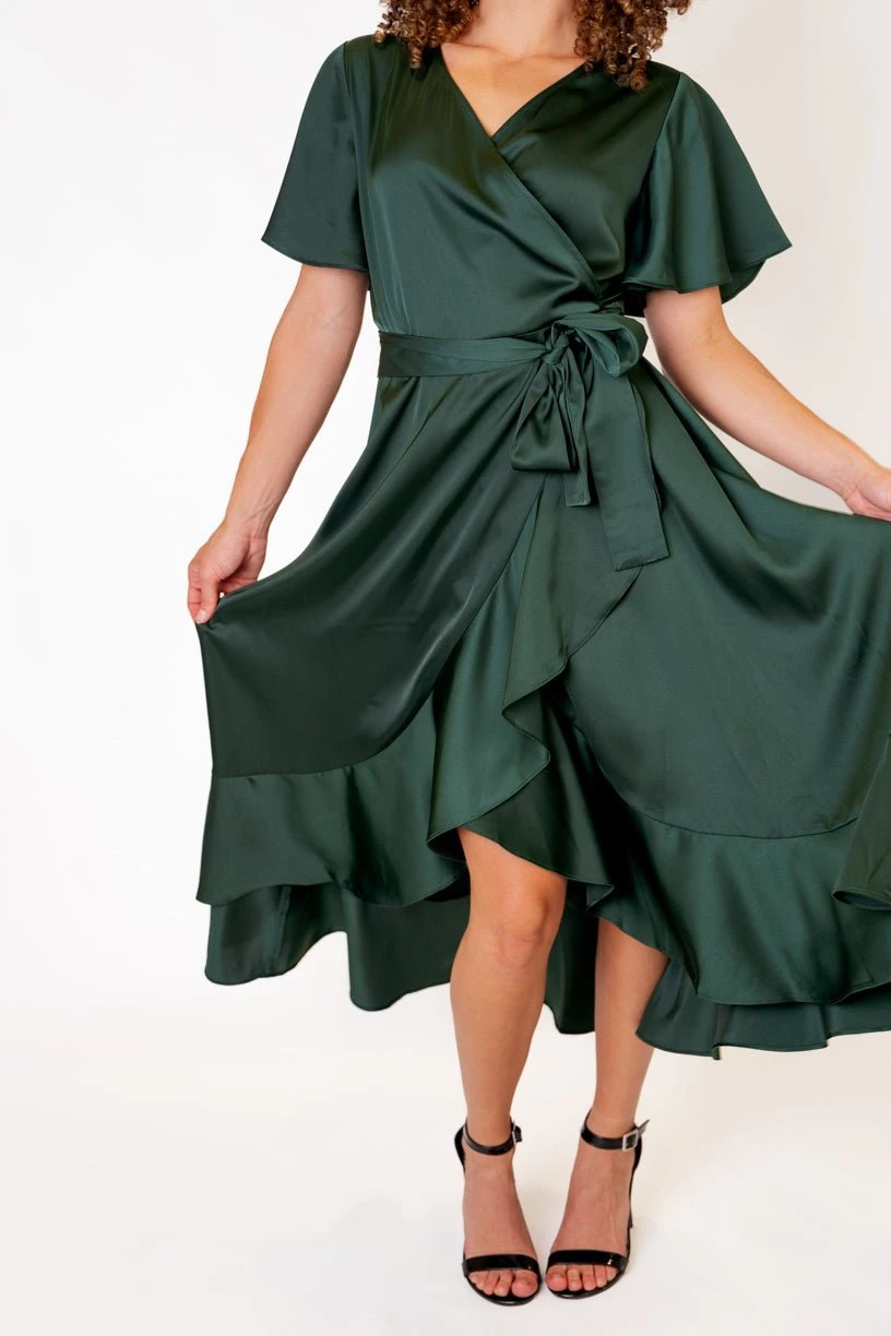green satin wrap midi dress