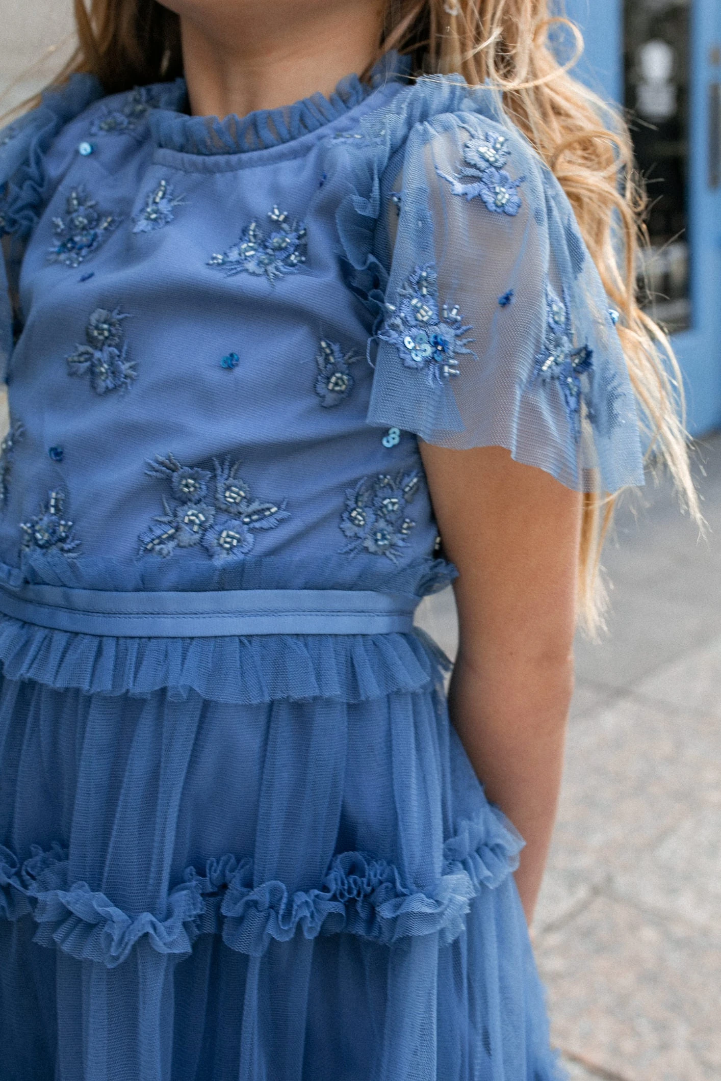 blue beaded tulle flutter sleeve midi dress