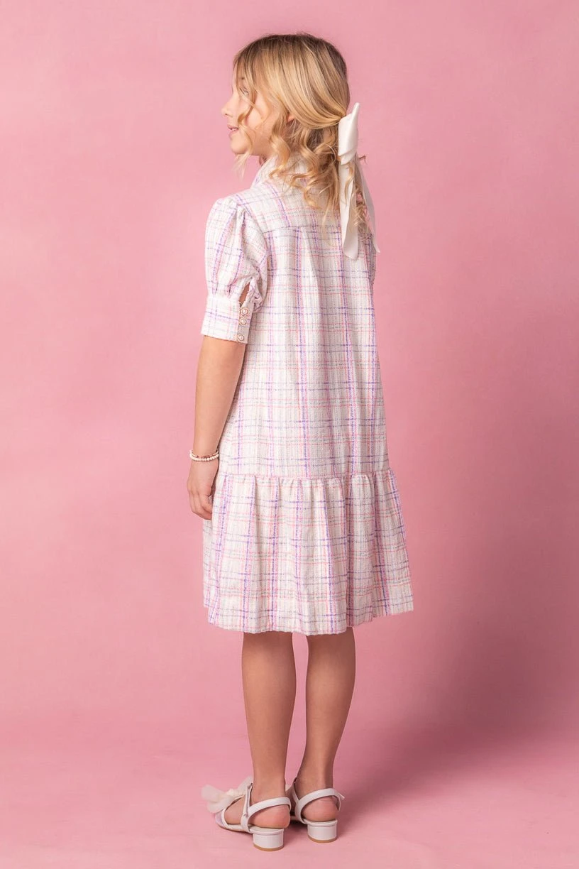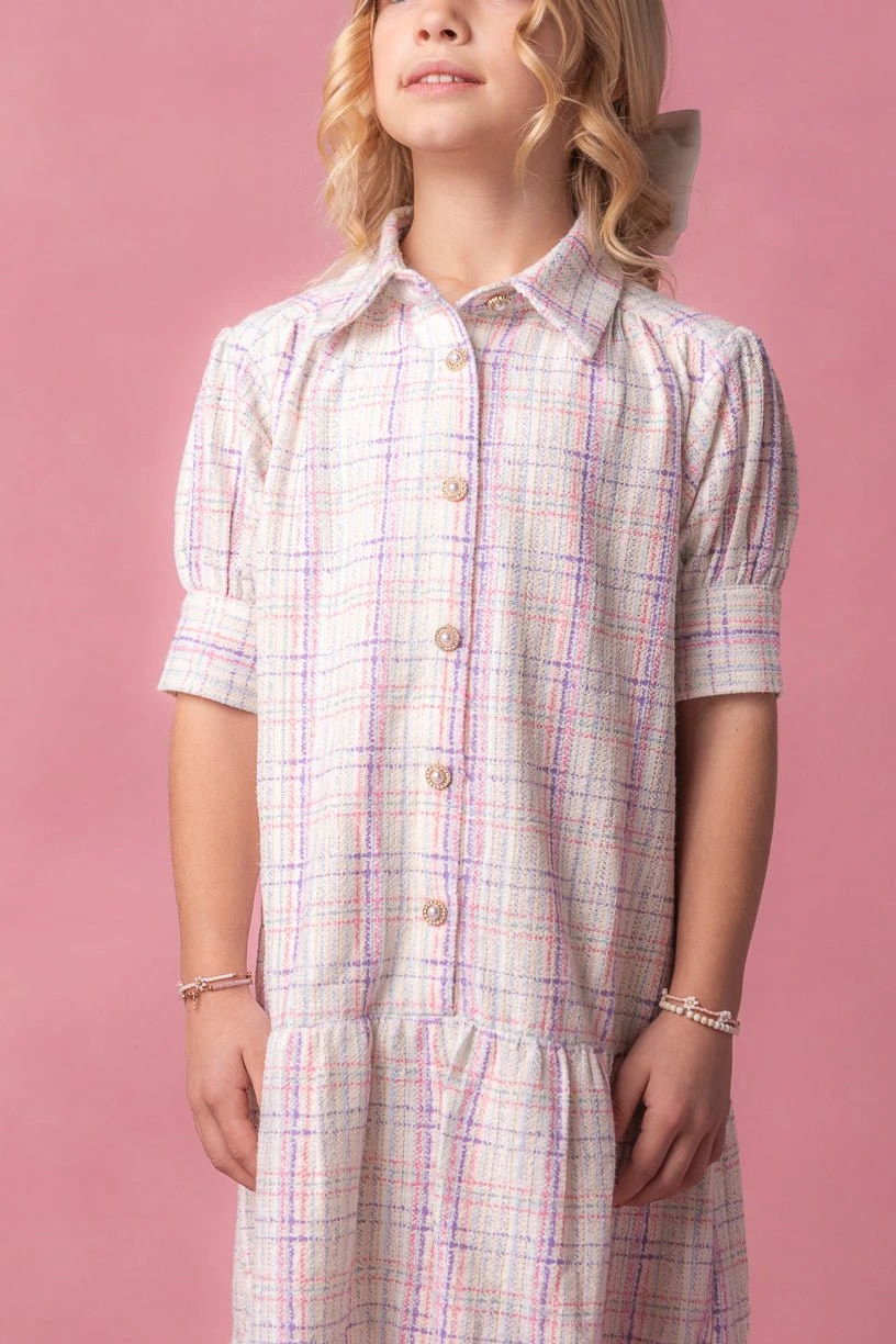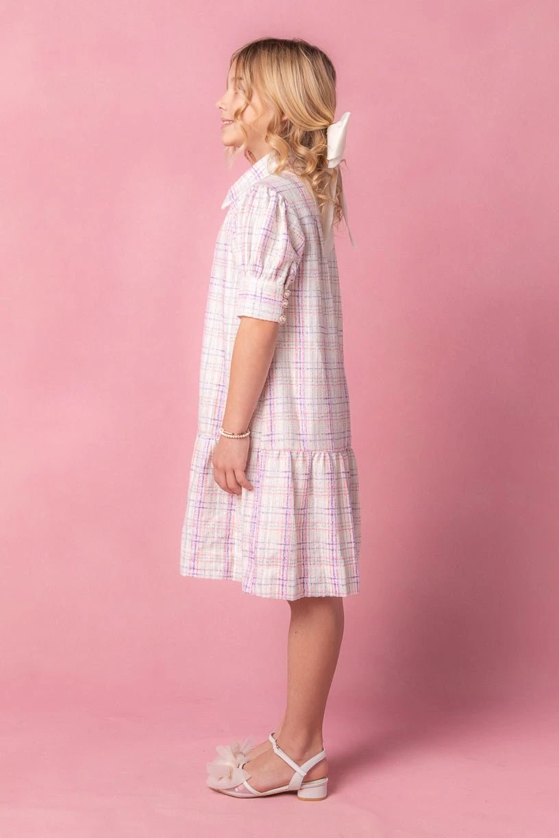 white tweed button up knee length dress