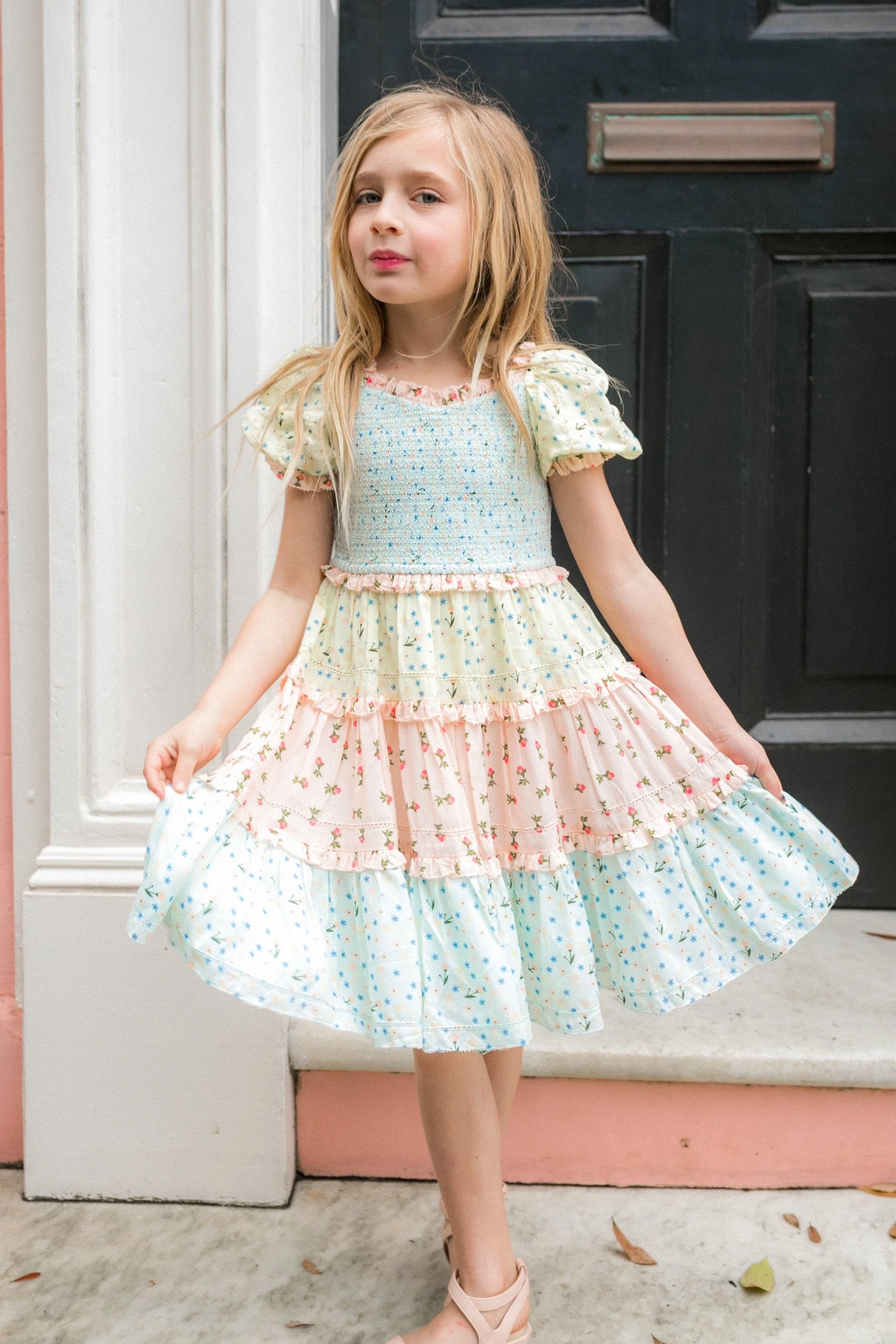 multicolor tiered smocked midi dress