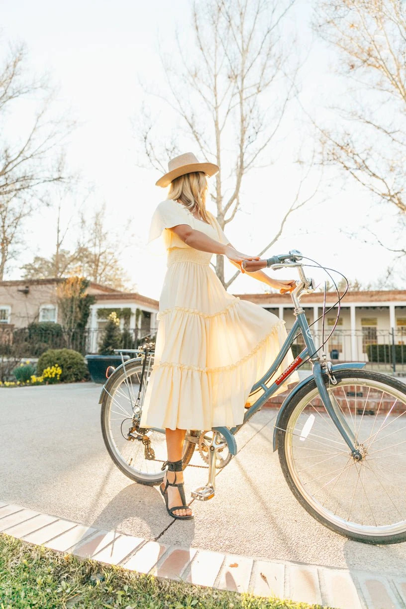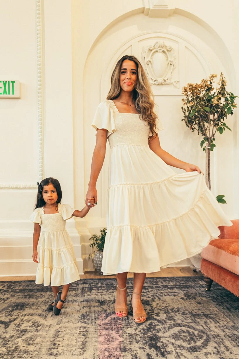 cream flutter sleeve smocked midi dress