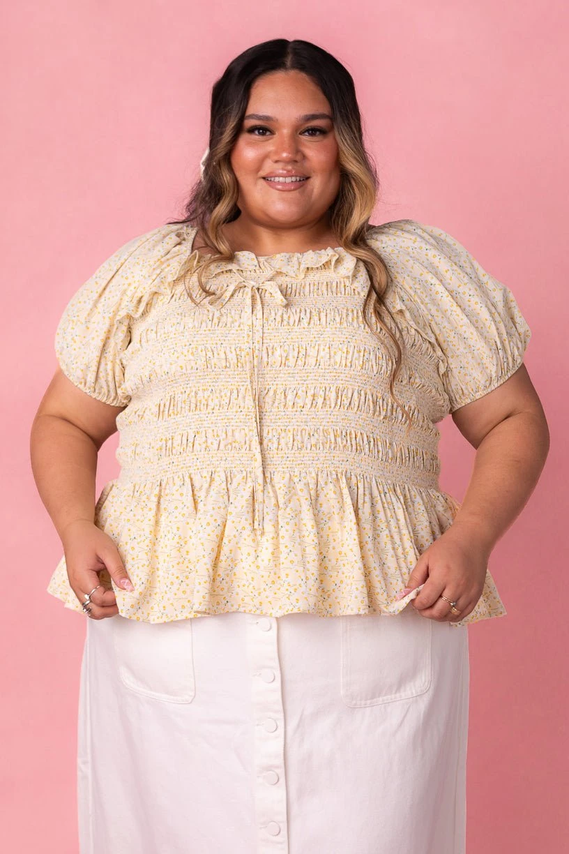 yellow floral smocked peplum blouse